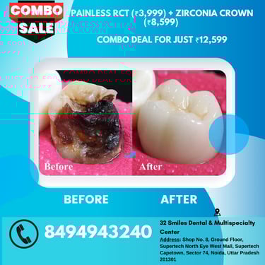 Take advantage of our Painless RCT (₹3,999) and Zirconia Crown (₹8,599) combo deal for just ₹12,599. This offer is perfect for those looking for a cost-effective and high-quality solution for dental issues.